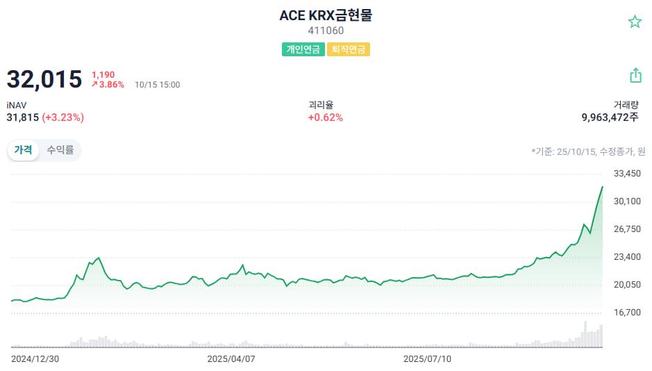 ACE KRX금현물은 국내 ETF 시장에서 처음으로 출시된 금 현물 ETF다. 선물이 아닌 현물에 투자하기때문에 퇴직연금 계좌에서도 담을 수 있다는 장점이 있다. 자산운용업계 관계자는 "미중 무역갈등, 미국 정부 셧다운 등 불확실성이 커지면서 금 투자 수요가 더욱 강해지고 있다"며 "미국 금리 인하기조로 달러가치가 약세로 돌아서면서 금 상승세가 이어지고 있다"고 설명했다.
